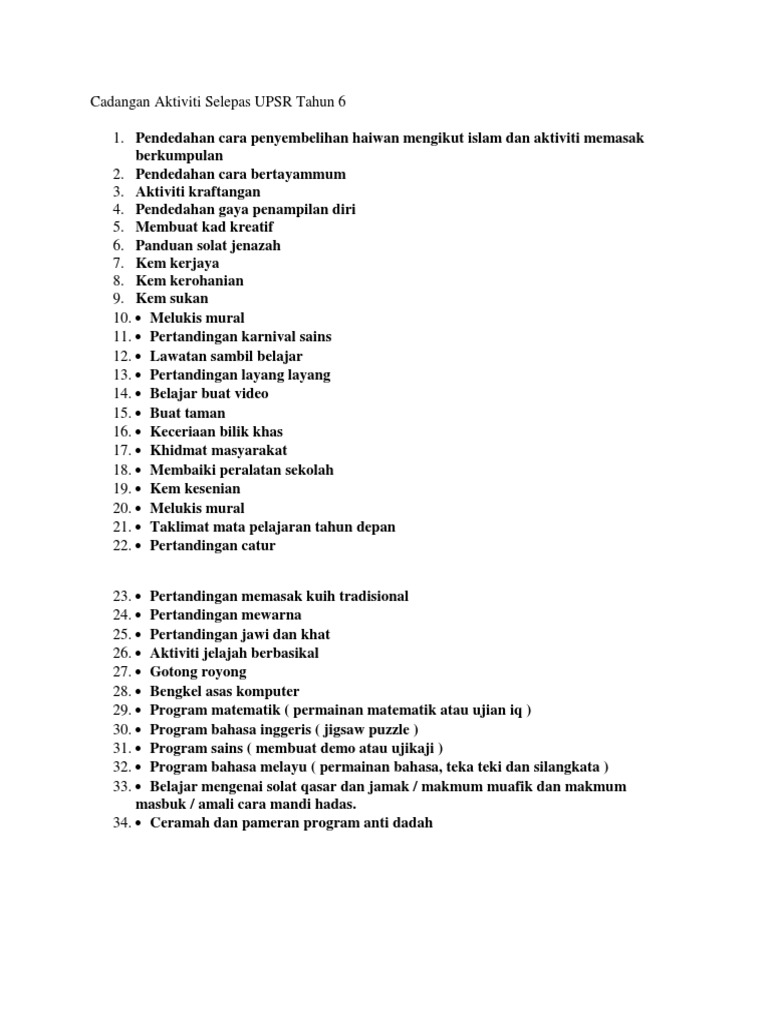 Aktiviti-aktiviti yang dirancang saban tahun adalah untuk mengisi masa murid-murid selepas UPSR. 11 Contoh Karangan UPSR Terbaik Bahasa Melayu. Guru-guru boleh pilih mengikut kesesuaian masing-masing.